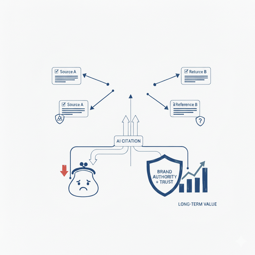 Even without a click, being cited signals relevance, accuracy, and authority to both users and search algorithms. It’s a credibility indicator that strengthens your position in AI‑driven search, even without traffic.