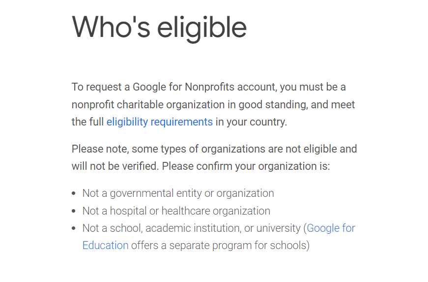 There is a process involved to apply for a Google for Nonprofits account. As mentioned above you must be a 501c3 nonprofit organization in good standing for acceptance into the program. First, you need to register your nonprofit organization with TechSoup. TechSoup is an organization that handles your verification process. If you are already registered with Tech Soup, make sure you have your verification token handy. Please note that the following organizations are not eligible for this Google Ads Grant program.