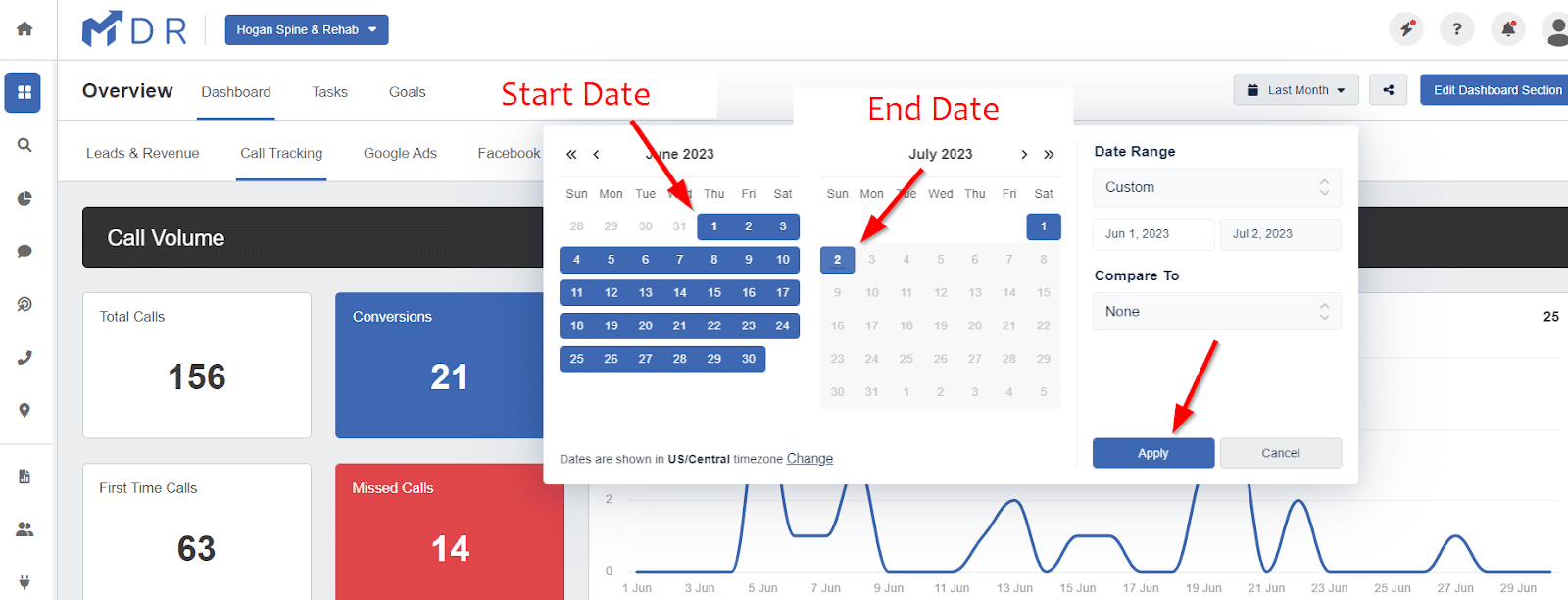 Once logged in to your Marketing Dashboard at https://clients.marketingdr.co/, click the selector at the top right of the dashboard to set a date range.