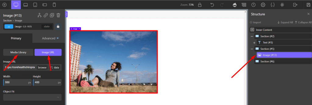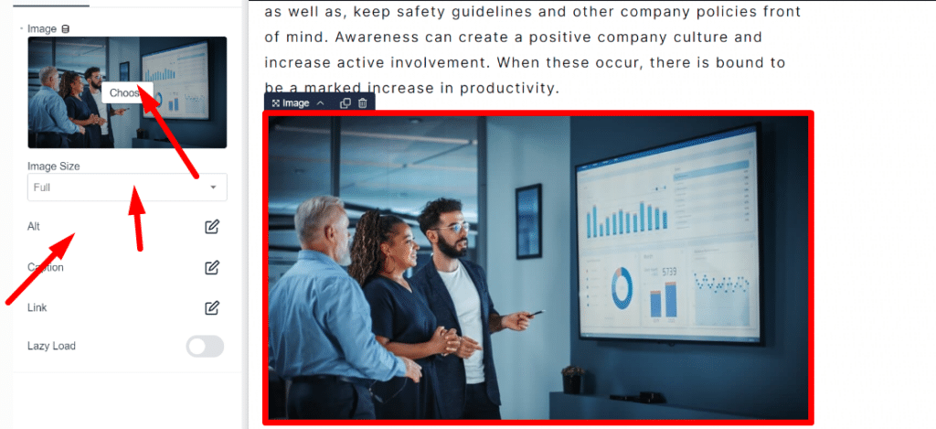 - If you want to change the picture on the page, select the image or placeholder where the picture is currently displayed. Click “Choose” and select a new image from your media library. You can also select to add the alt text and other details on the settings menu.