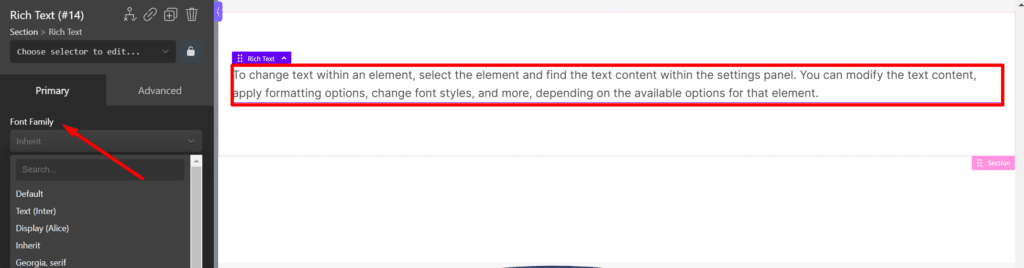 - To change text within an element, select the element and find the text content within the settings panel. You can modify the text content, apply formatting options, change font styles, and more, depending on the available options for that element.