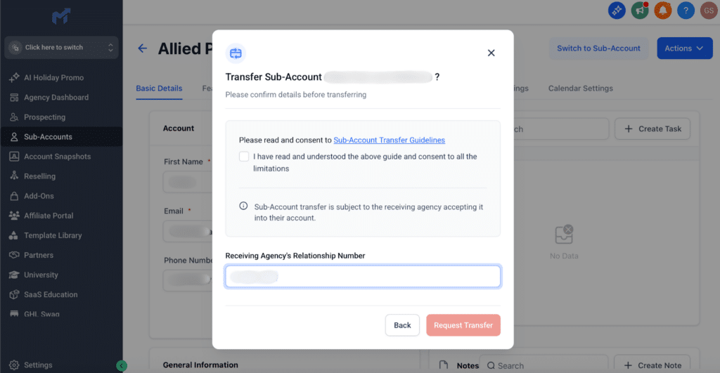 To move your account smoothly into our HighLevel agency, we follow a structured process that ensures all assets, phone numbers, and workflows transfer correctly with minimal interruption to your operations. Below is an outline of how the transfer works and what steps are involved.