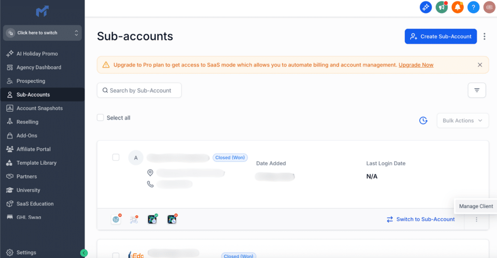 Go to Agency View → Sub-Accounts → Manage Client (your location)