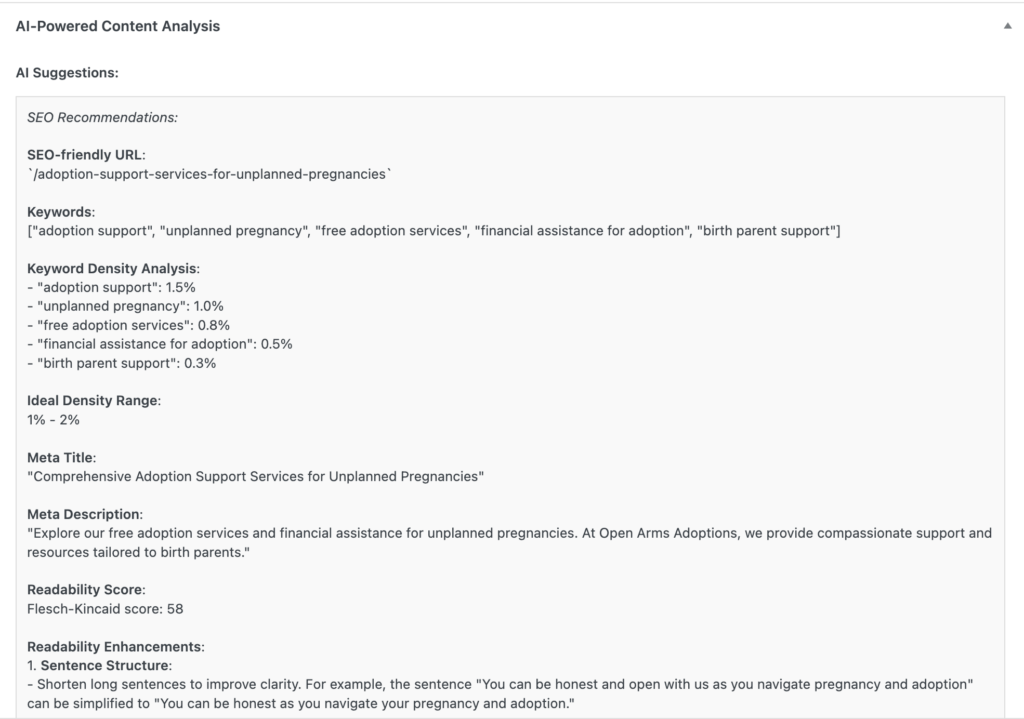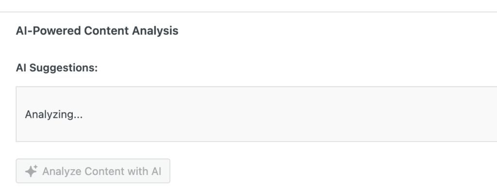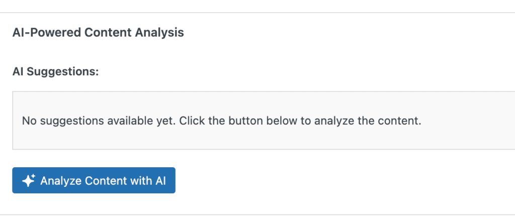 Once configured, you’ll notice a new AI-Powered Content Analysis meta box in the WordPress editor when creating or editing posts and pages. This is where you can run the AI analysis and view the suggestions for improving your content